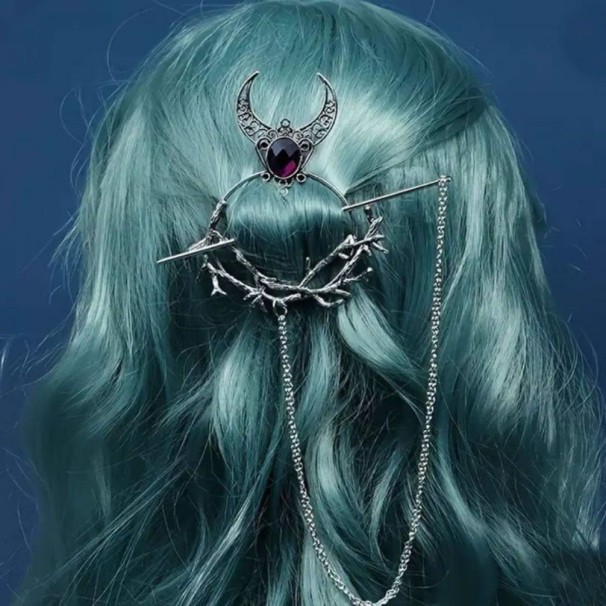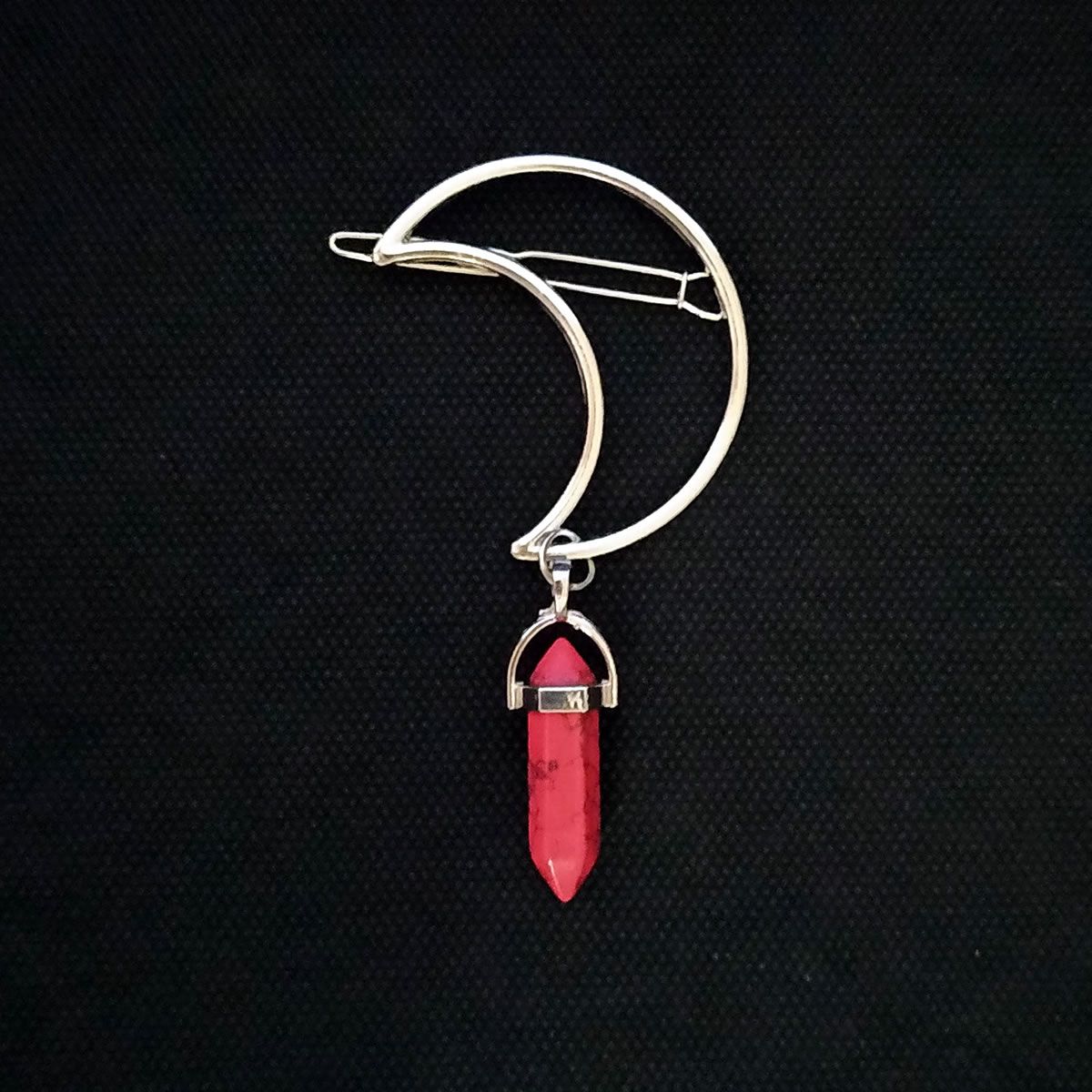 Broche con luna plateada para cabello, con prisma hexagonal de cuarzo rojo.