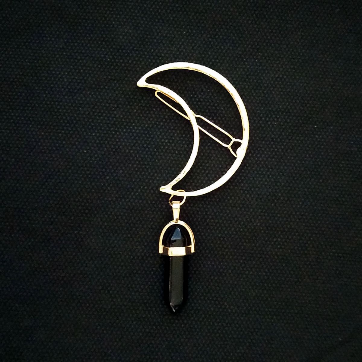 Broche con luna dorada para cabello, con prisma hexagonal de cuarzo negro.