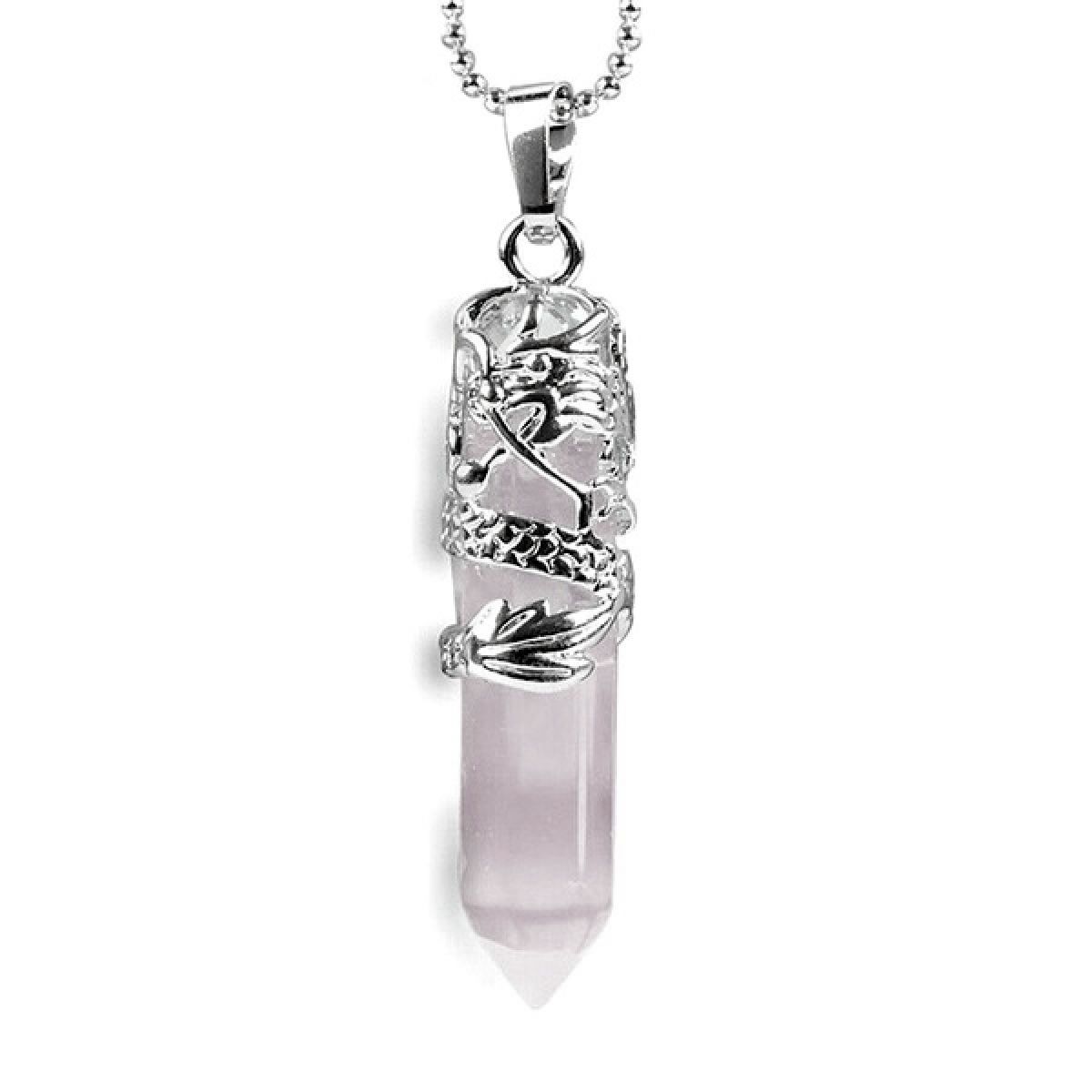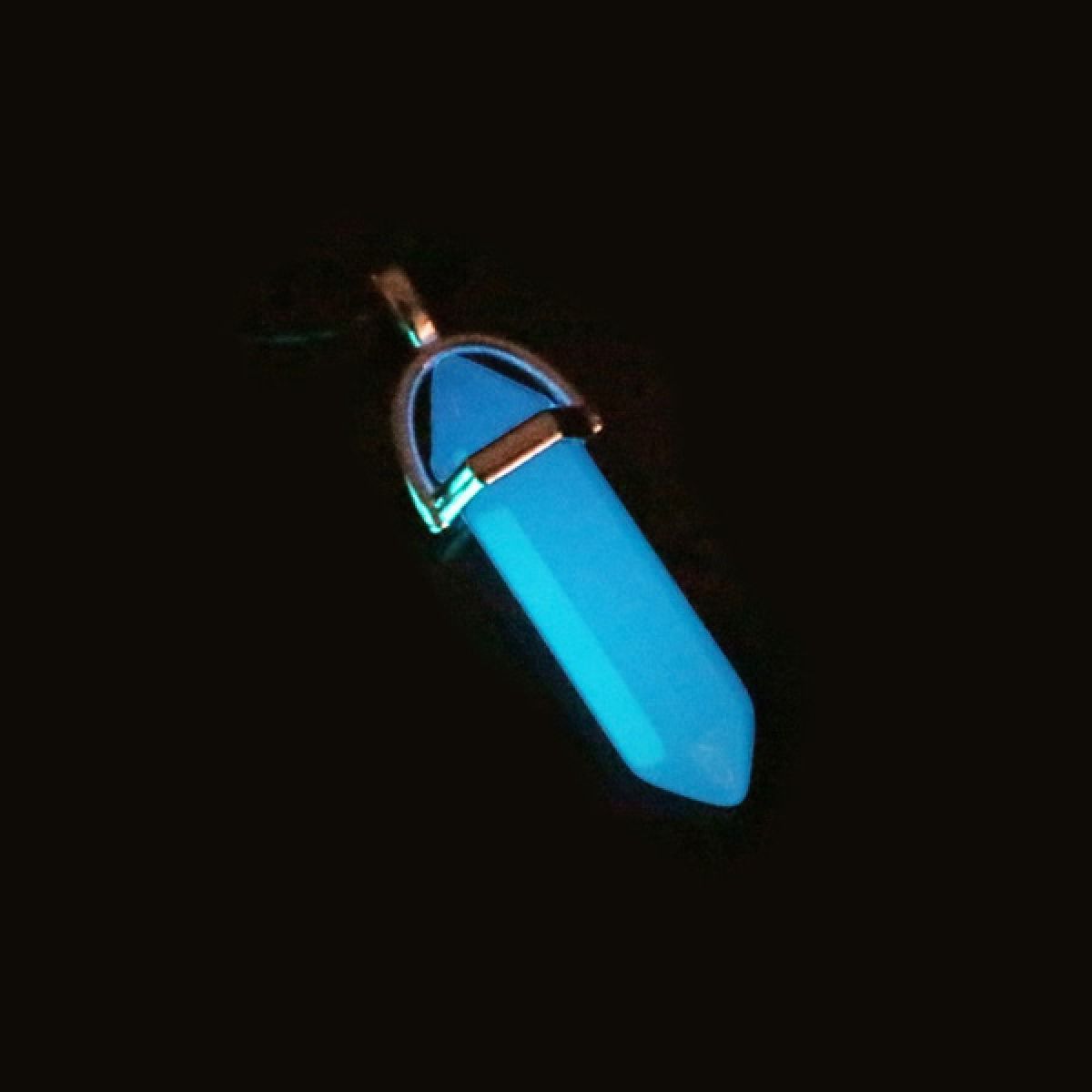 Colgante de cristal de cuarzo hexagonal brillante en la oscuridad.
