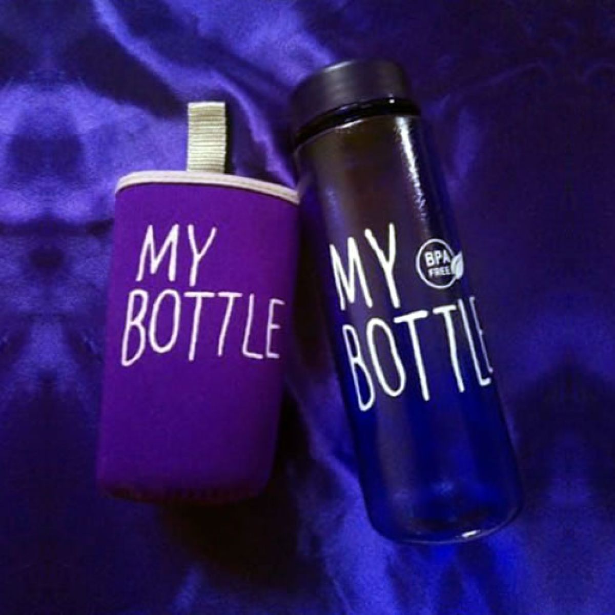 Botella para agua color morado, cuenta con un cubre botella para bebidas calientes.