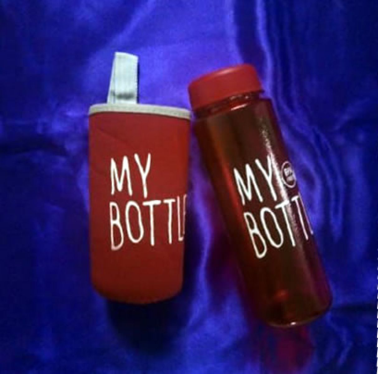 Botella para agua color rojo, cuenta con un cubre botella para bebidas calientes.
