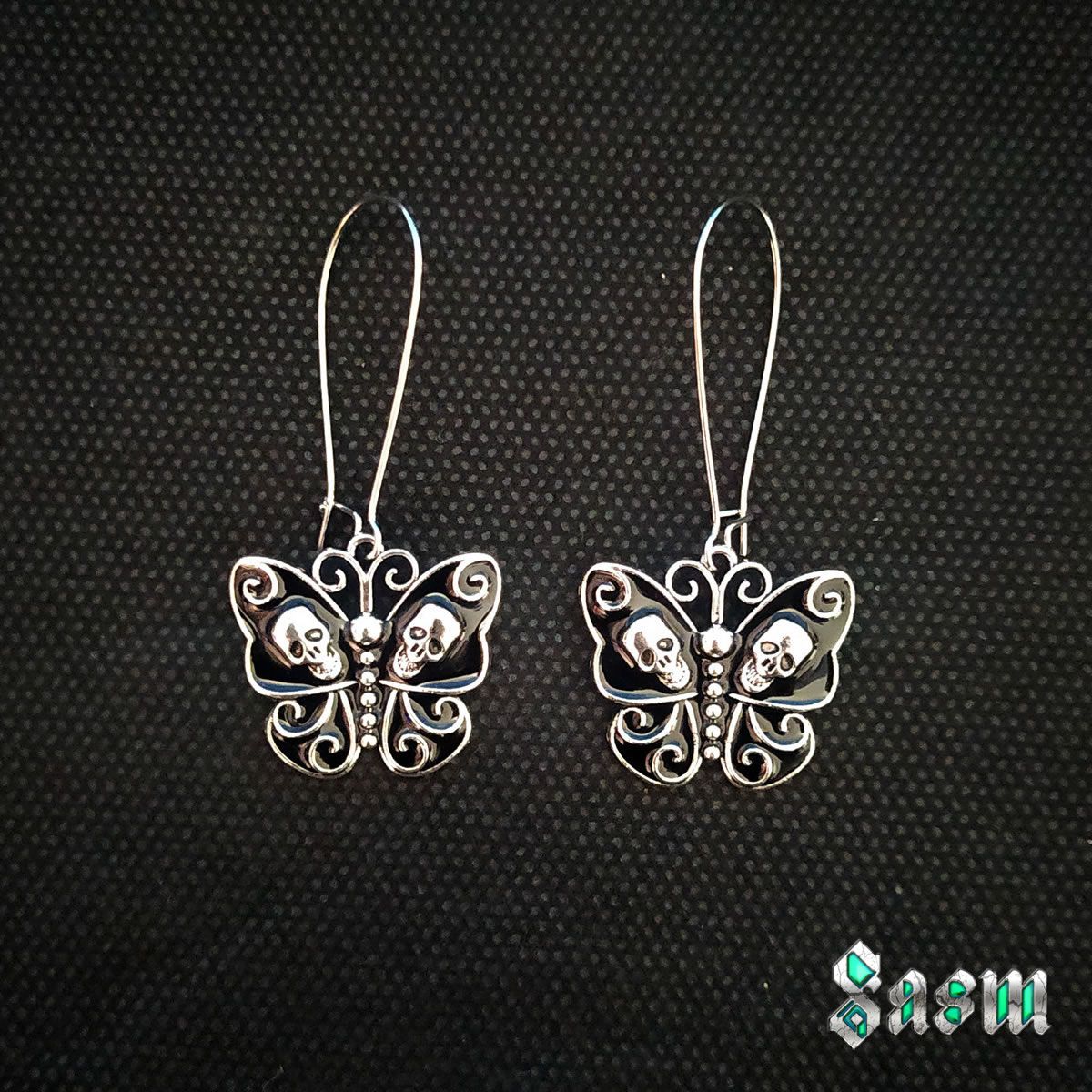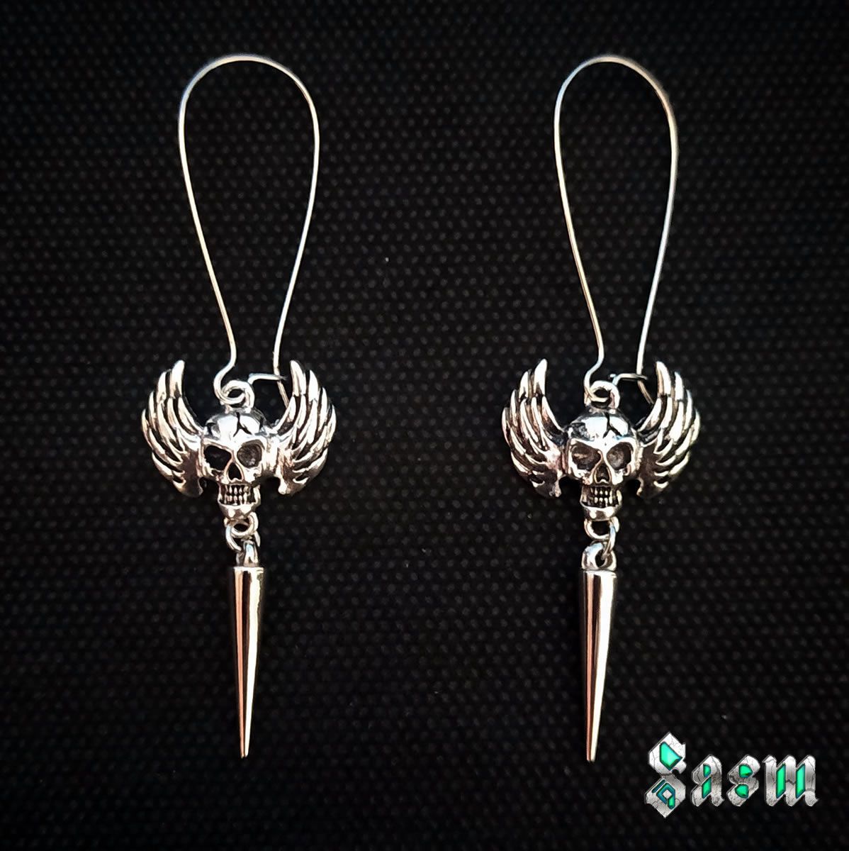 Pendientes de mano de esqueleto plateada y rosa negra.