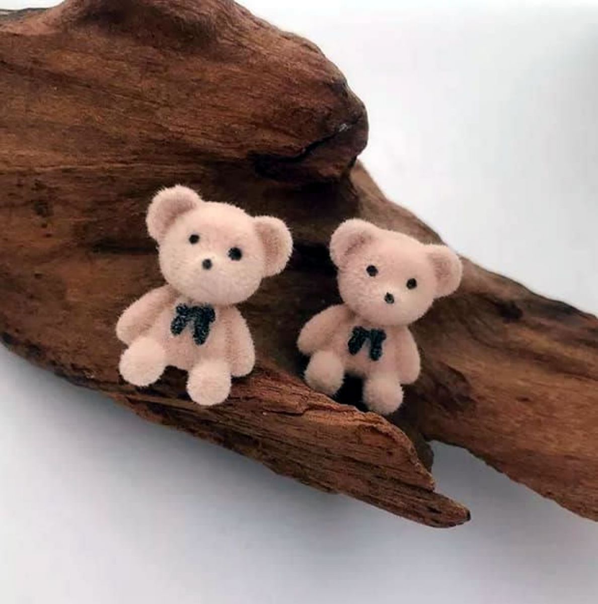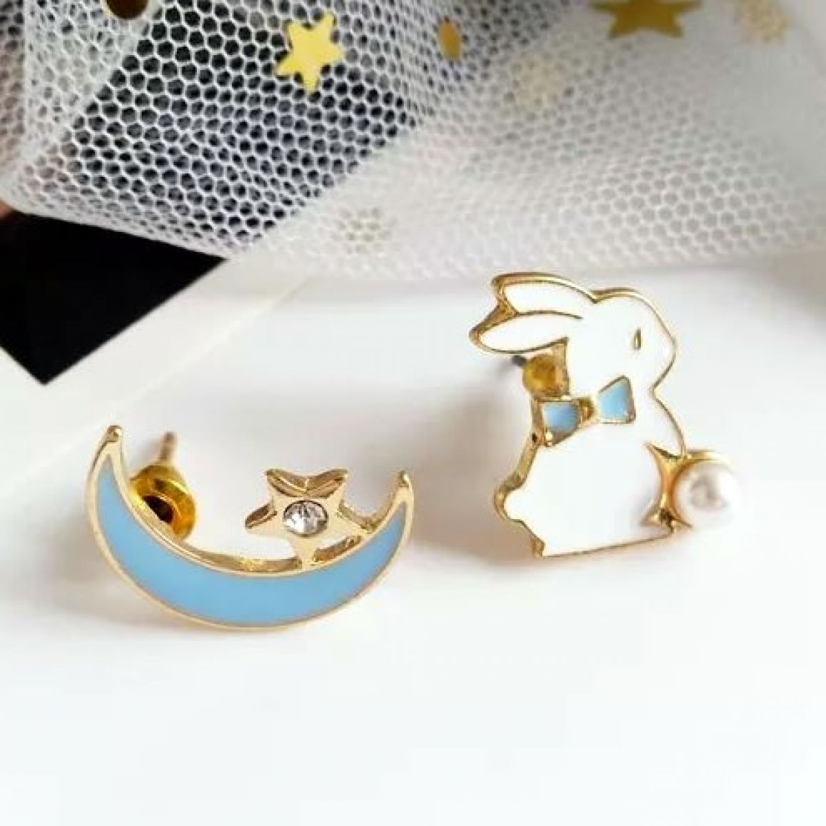 Pendientes asimétricos con una luna y conejo color azul y dorado.