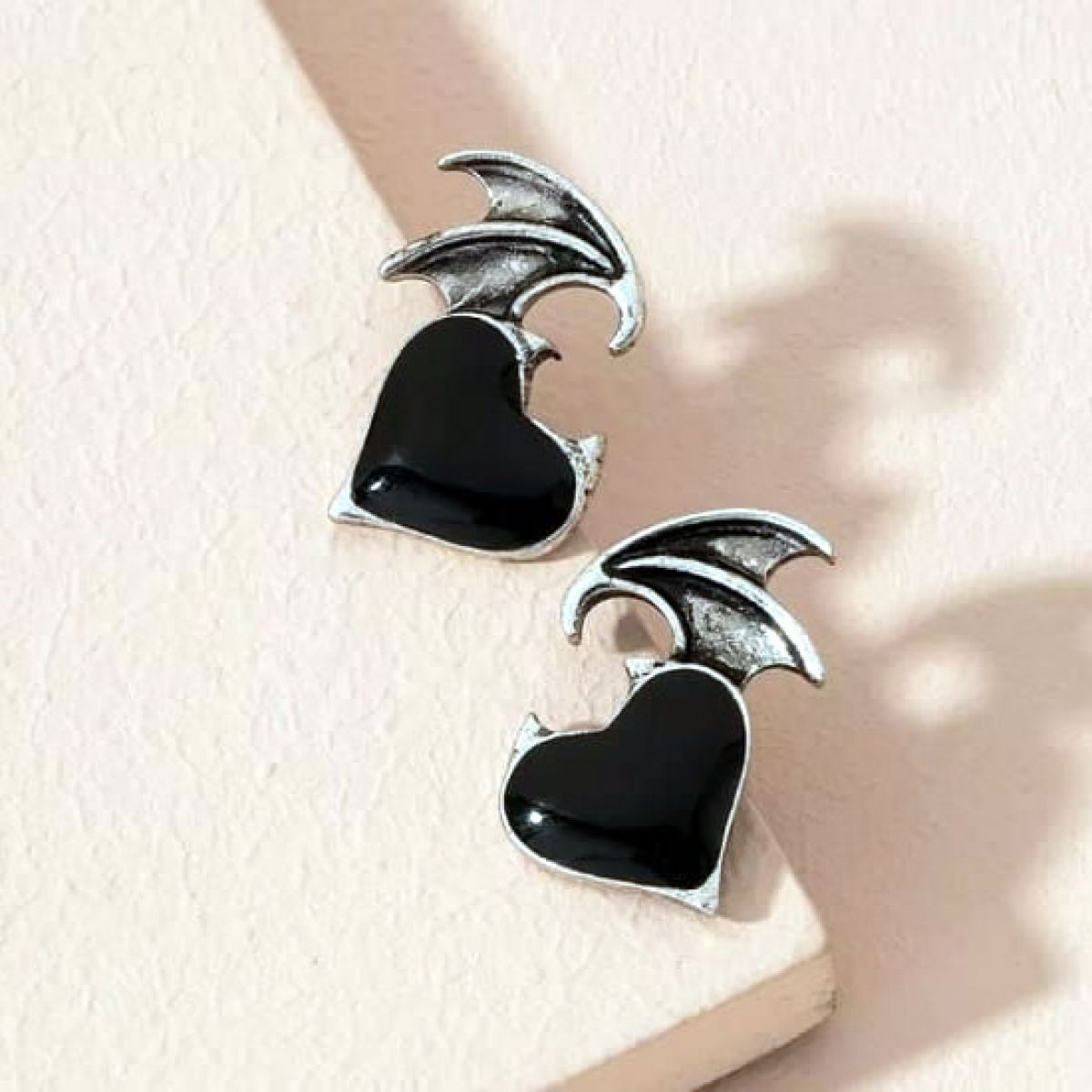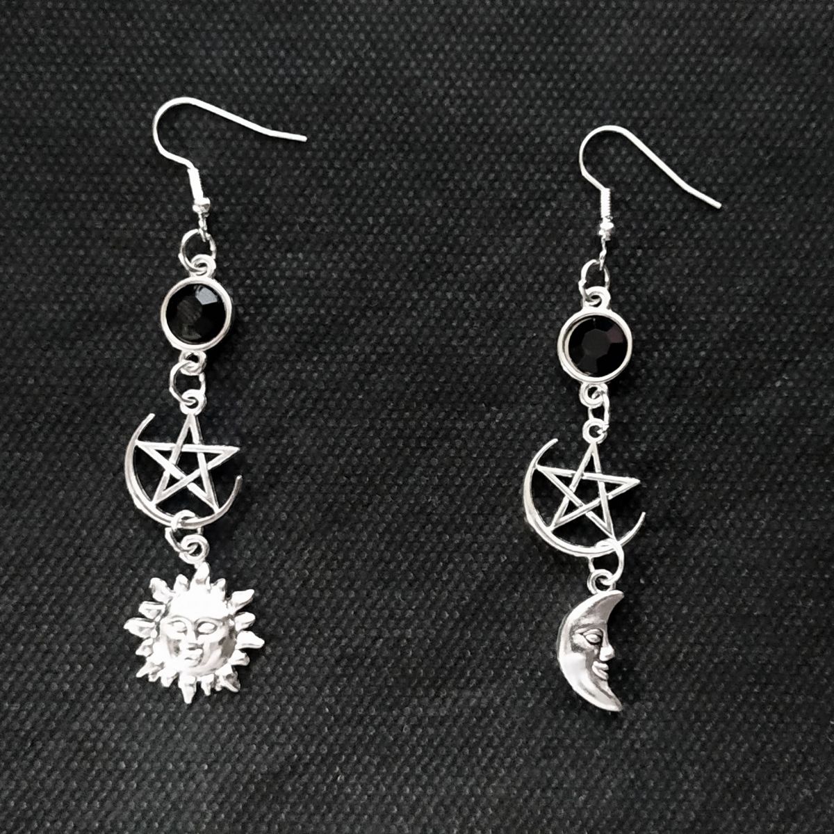 Pendientes con luna y sol con piedra negra y pentagrama.