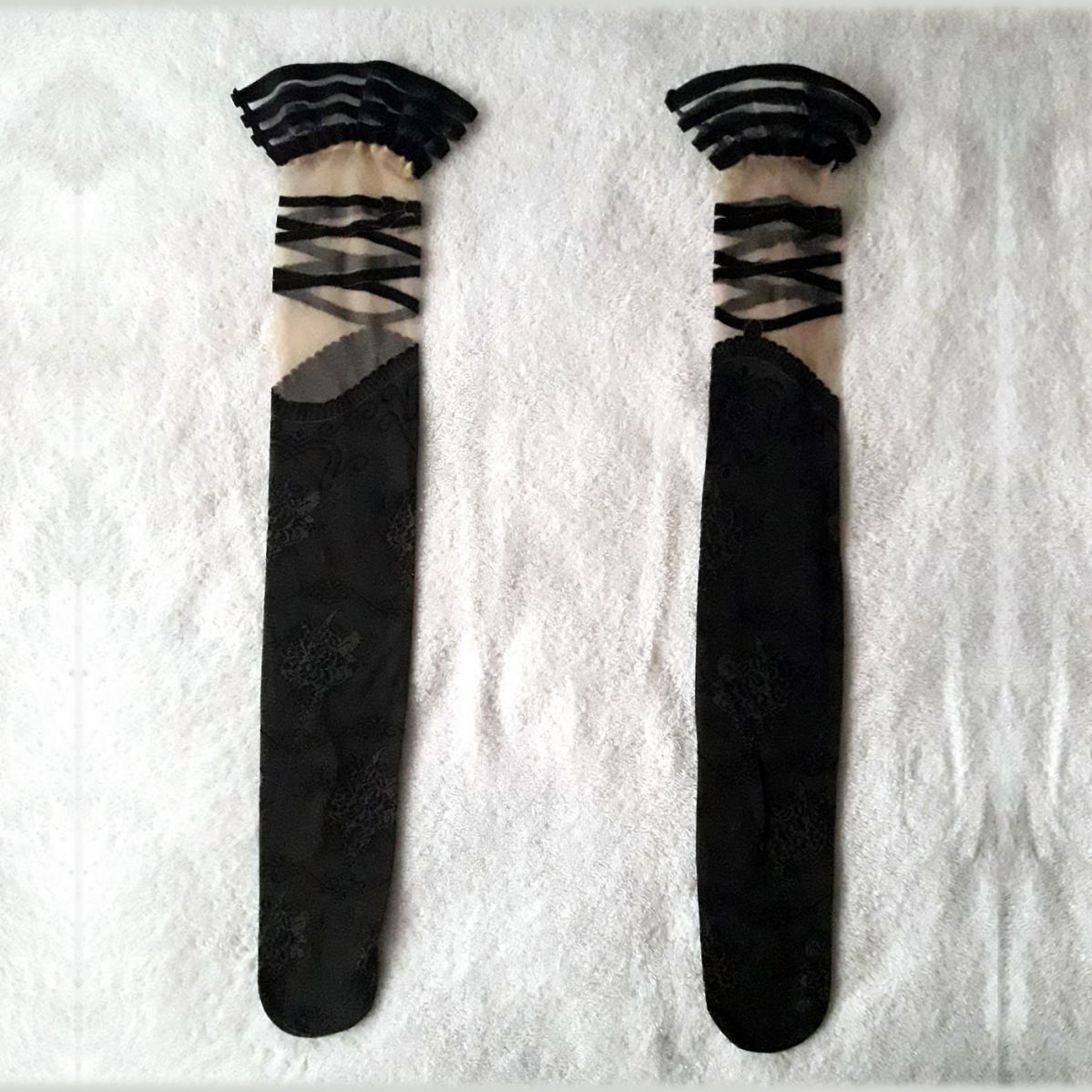 Calcetas tipo medias con adornos arriba de la rodilla, viene con dibujos del lado del color negro.