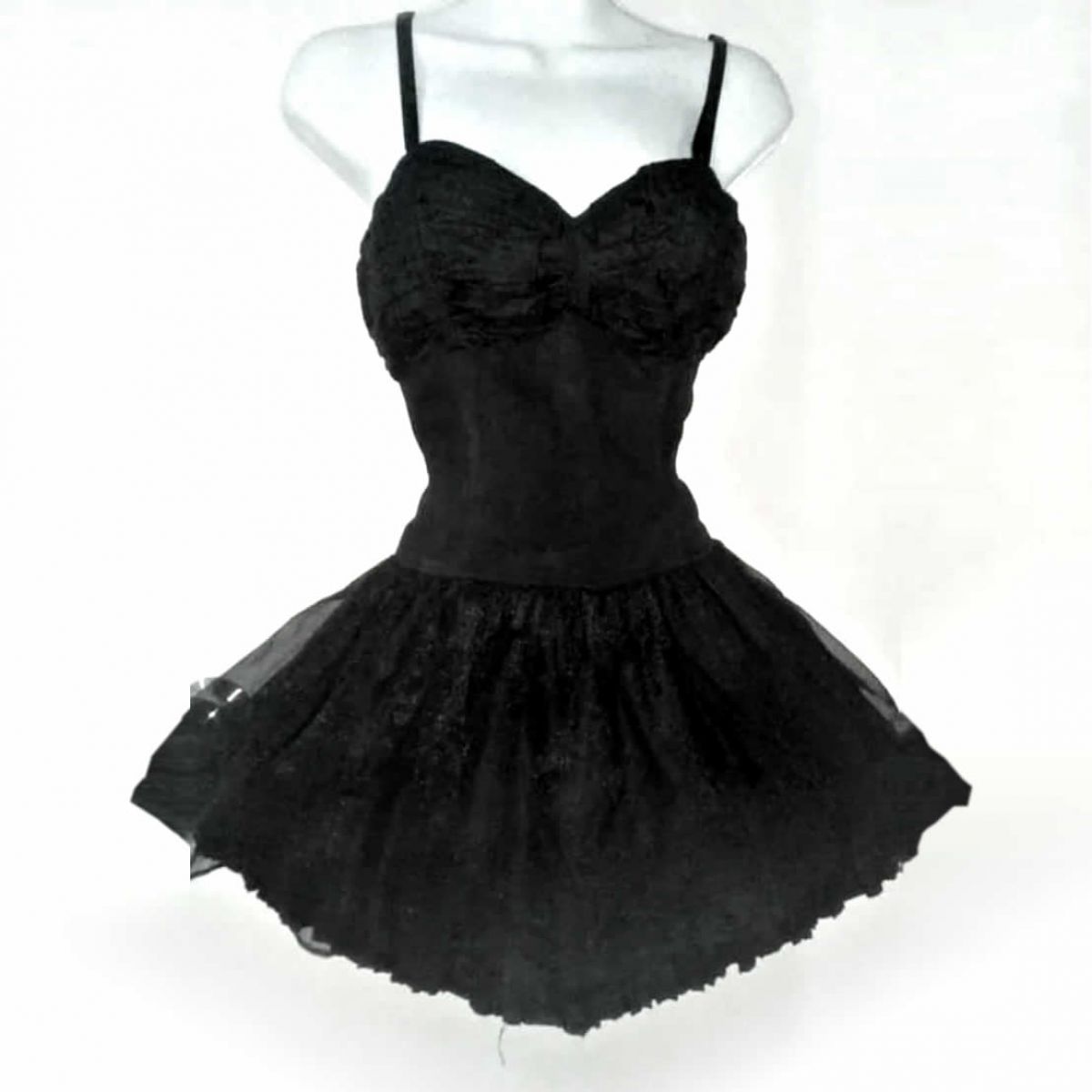 Vestido negro con bellos detalles texturizados en busto, falda cubierta en malla y detalles, tirantes ajustables. Talla Grande