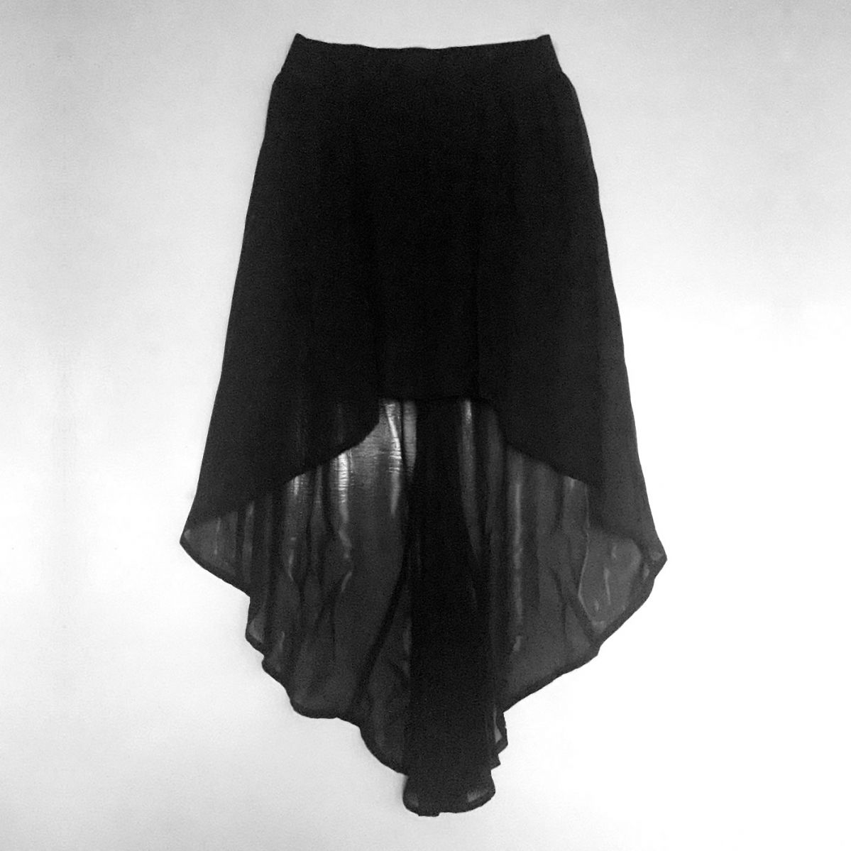 Falda larga negra con corte largo en la parte de atrás y mas corto en la parte frontal (tela un poco transparente). Cintura elástica