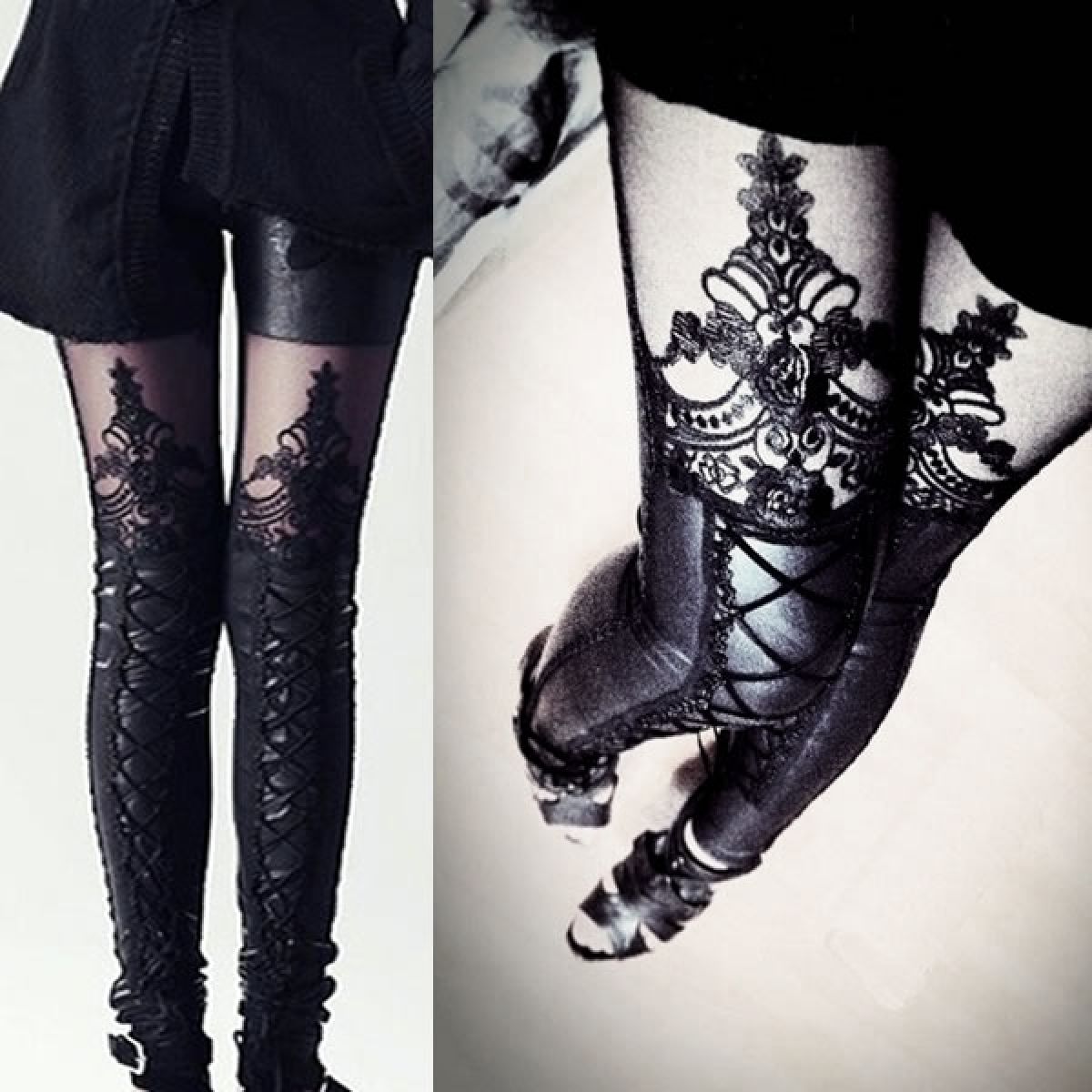 Leggings pantalones imitación cuero negro con encaje, modelo gótico punk.